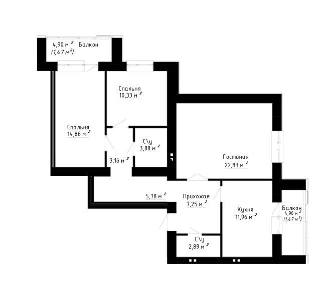 Трехкомнатная квартира 90.3 м2