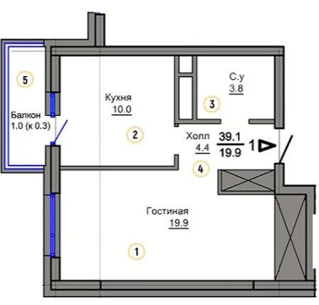 Однокомнатная квартира 39.1 м2