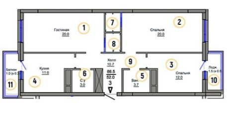Трехкомнатная квартира 85.6 м2