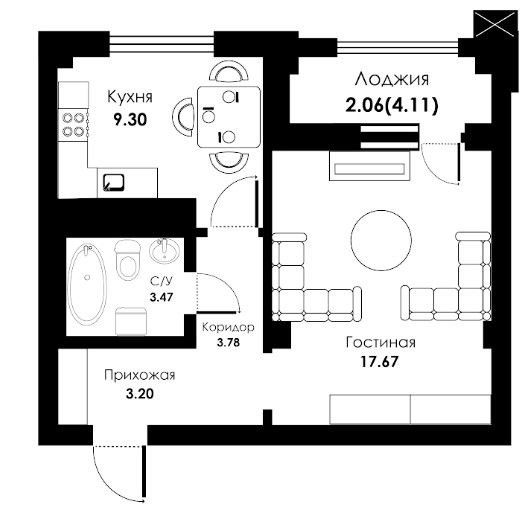 Однокомнатная квартира 39.46 м2