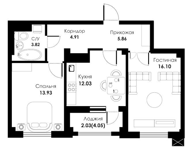 Двухкомнатная квартира 58.68 м2