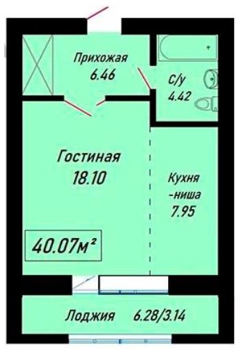 Однокомнатная квартира 40.07 м2