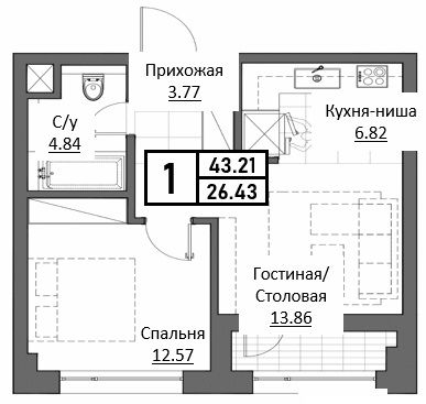 Однокомнатная квартира 43.21 м2