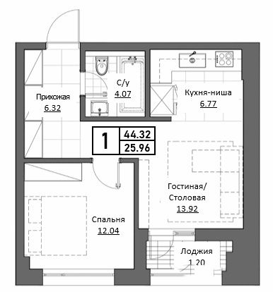 Однокомнатная квартира 44.32 м2