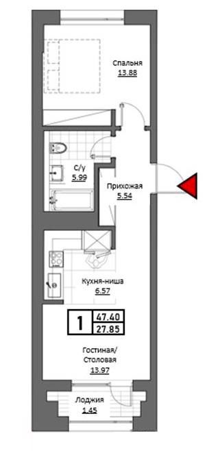 Однокомнатная квартира 47.4 м2
